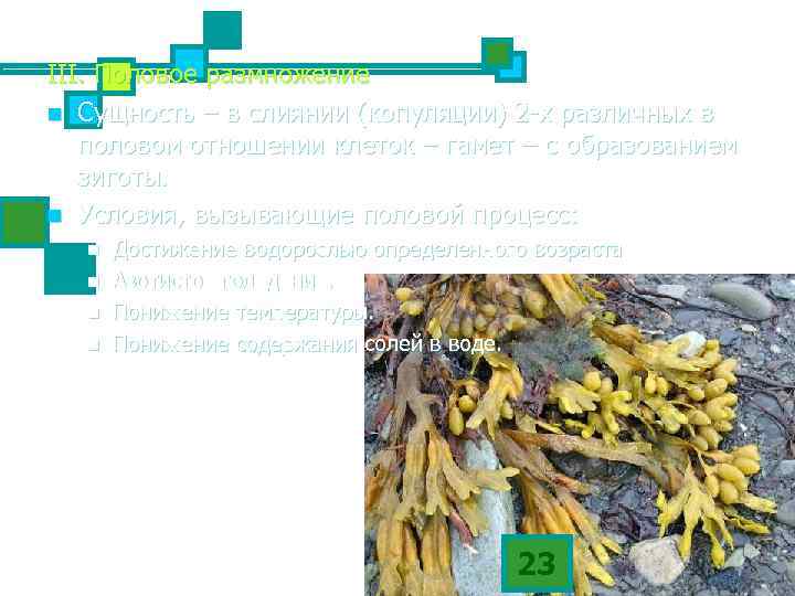 III. Половое размножение n Сущность – в слиянии (копуляции) 2 -х различных в половом отношении клеток – гамет – с образованием зиготы. n Условия, вызывающие половой процесс: n n Достижение водорослью определенного возраста Азотистое голодание. Понижение температуры. Понижение содержания солей в воде. 23