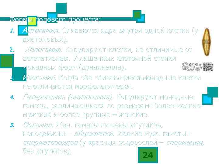Формы полового процесса: 1. Автогамия. Сливаются ядра внутри одной клетки (у диатомовых). 2. Хологамия. Копулируют клетки, не отличимые от вегетативных. У лишенных клеточной стенки монадных форм (дуналиелла). 3. Изогамия. Когда обе сливающиеся монадные клетки не отличаются морфологически. 4. Гетерогамия (анизогамия). Копулируют монадные гаметы, различающиеся по размерам: более мелкие – мужские и более крупные – женские. 5. Оогамия. Жен. гаметы лишены жгутиков, неподвижны – яйцеклетки. Мелкие муж. гаметы – сперматозоидов (у красных водорослей – спермации, без жгутиков). 24
