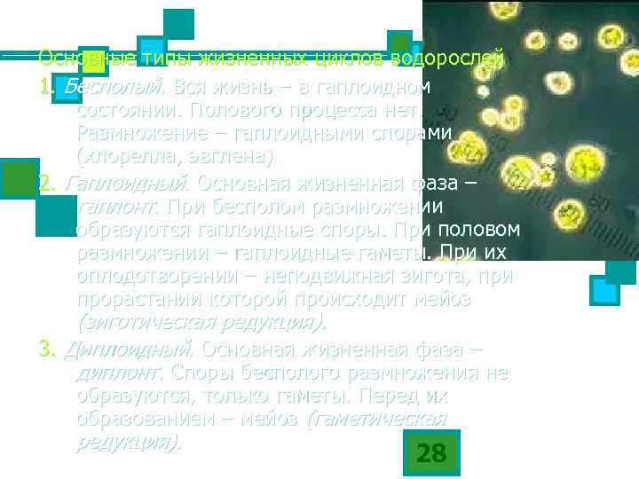 Основные типы жизненных циклов водорослей 1. Бесполый. Вся жизнь – в гаплоидном состоянии. Полового процесса нет. Размножение – гаплоидными спорами (хлорелла, эвглена) 2. Гаплоидный. Основная жизненная фаза – гаплонт. При бесполом размножении образуются гаплоидные споры. При половом размножении – гаплоидные гаметы. При их оплодотворении – неподвижная зигота, при прорастании которой происходит мейоз (зиготическая редукция). 3. Диплоидный. Основная жизненная фаза – диплонт. Споры бесполого размножения не образуются, только гаметы. Перед их образованием – мейоз (гаметическая редукция). 28