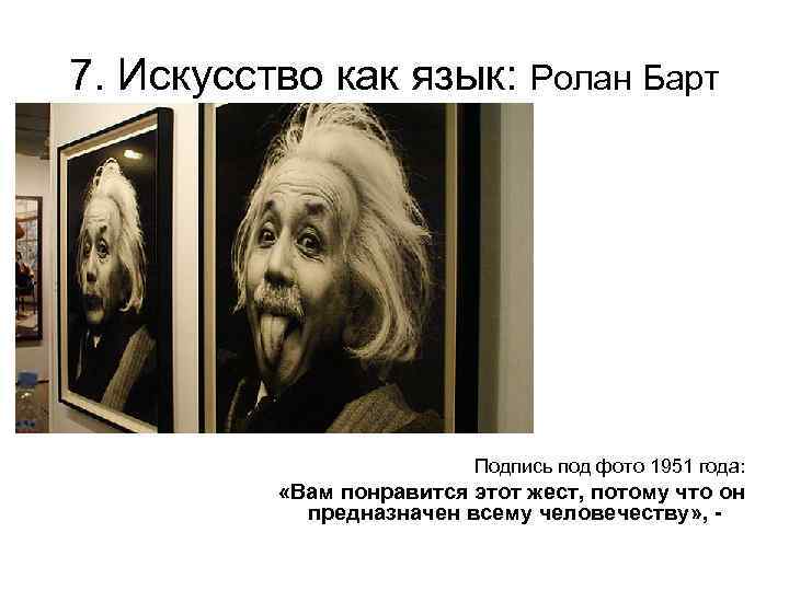 7. Искусство как язык: Ролан Барт Подпись под фото 1951 года: «Вам понравится этот жест, потому что он предназначен всему человечеству» , -