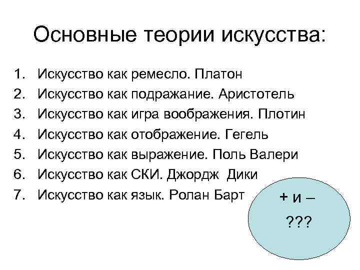 Основные теории искусства: 1. 2. 3. 4. 5. 6. 7. Искусство как ремесло. Платон Искусство как подражание. Аристотель Искусство как игра воображения. Плотин Искусство как отображение. Гегель Искусство как выражение. Поль Валери Искусство как СКИ. Джордж Дики Искусство как язык. Ролан Барт +и– ? ? ?