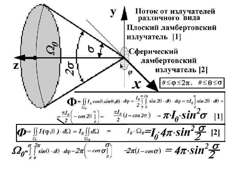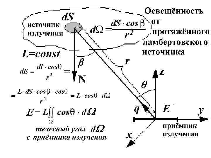 Ламбертовский излучатель - это такой излучатель, у которого яркость постоянна и не зависит от направления (то есть не зависит от положения точки на поверхности и от угла наблюдения). Плоский ламбертовский излучатель Силу света от такого источника можно вычислить, зная яркость источника: S 0– источник, I 0– сила света в направлении нормали к поверхности, q– угол между рассматриваемым направлением и нормалью. Сферический ламбертовский излучатель Сила света от сферического ламбертовского источника постоянна во всех направлениях: