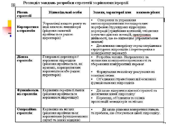 n ділова бізнесова стратегія – стратегія забезпечення n Функціональні стратегії розробляються функціональними n Операційні стратегії розробляються менеджерами нижчої довгострокових конкурентних переваг підприємства чи його господарського підрозділу. Ця стратегія часто втілюється в бізнес-планах і показує, як підприємство буде конкурувати на конкретному товарному ринку; кому саме і по яких цінах буде продавати продукцію, як буде її рекламувати, як буде домагатися перемоги в конкурентній боротьбі і т. д. відділами і службами підприємства на основі корпоративної і ділової стратегії. Це стратегія маркетингу, фінансова, виробнича стратегія і т. д. Метою функціональної стратегії є розподіл ресурсів відділу (служби), пошук ефективної поведінки функціонального підрозділу в рамках загальної стратегії. ланки залежно від специфіки самого процесу виробництва та реалізації продукції. Це можуть бути такі види стратегії: виробнича, продуктова, зниження витрат виробництва, цінова, поведінки фірми на різних видах ринків та інші.