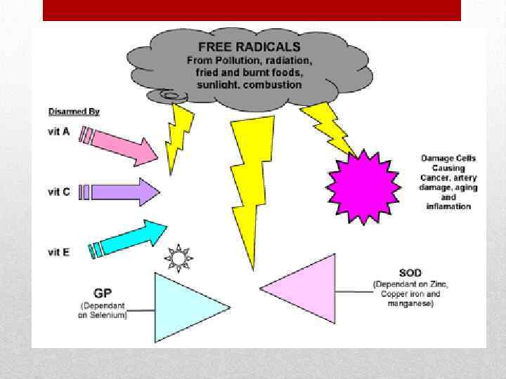 Причины образования свободных радикалов • избыточное поступление свободных радикалов в организм в связи с повышенным радиационным фоном, загрязнением окружающей среды, курением, употреблением некачественной пищи (продуктов, содержащих нитраты, соли тяжелых металлов, пищевые красители, консерванты) и воды; • дефицит веществ, участвующих в процессах нейтрализации и выведения свободных радикалов: витаминов (особенно антиоксидантов А, С, Е), микро и макроэлементов, биофлавоноидов.