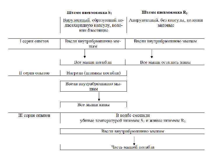 Вывод: под действием трансформирующего фактора живые авирулентные пневмококки приобрели вирулентные свойства штамма S 2. В 1944 г Эвери доказал, что этим фактором является ДНК.