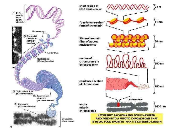 Уровни укладки ДНК в хромосому 1. Нуклеосомный 2. Хроматиновые фибриллы (соленоид) 30 nm 1 2 (нуклеомерный) 3. Хроматиновые филаменты (Хроматиновые петли домены) (хромомерный) 4. Суперспирализованные 3 4 филаменты (минибенд) (хромонемный) 5. Хромосомный (Метафазная хромасома) 5