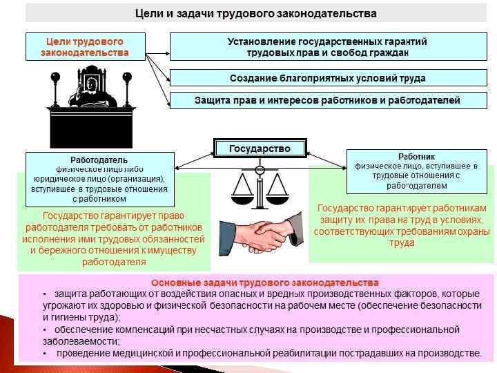 ТРУДОВОЙ КОДЕКС РФ v v v v Цель трудового законодательства: установление государственных гарантий трудовых прав и свобод граждан, создание благоприятных условий труда, защита прав и интересов работников и работодателей. Основные задачи трудового законодательства: создание необходимых правовых условий для достижения оптимального согласования интересов сторон трудовых отношений, интересов государства, а также правовое регулирование трудовых отношений и иных непосредственно связанных с ними отношений по: организации труда и управлению трудом; трудоустройству у данного работодателя; профессиональной подготовке, переподготовке и повышению квалификации работников непосредственно у данного работодателя; социальному партнерству, ведению коллективных переговоров, заключению коллективных договоров и соглашений; участию работников и профессиональных союзов в установлении условий труда и применении трудового законодательства в предусмотренных законом случаях; материальной ответственности работодателей и работников в сфере труда; надзору и контролю (в том числе профсоюзному контролю) за соблюдением трудового законодательства (включая законодательство об охране труда); разрешению трудовых споров.