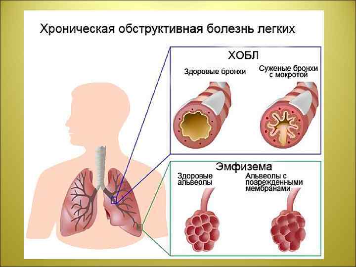 Хроническая обструктивная болезнь легких (ХОБЛ) • характеризуется необратимой или частично обратимой обструкцией бронхиального дерева. • ХОБЛ является следствием — хронического бронхита, тяжёлой бронхиальной астмы, эмфиземы лёгких, облитериирующий бронхиолит, муковисцидоз, бронхоэктатическая болезнь.