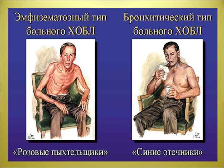 Клиника • Кашель, мокрота – 50 мл. в сутки слизистого характера, одышка. • Объективно: коробочный перкуторный звук, опущение нижних границ легких, жесткое везикулярное дыхание, хрипы сухие, усиливающиеся при выдохе. • Внелегочные признаки - снижение массы тела, головная боль, бессонница по ночам, сонливость днем. • У больных со среднетяжелым и тяжелым течением: 1. эмфизематозная форма – потеря массы тела и одышка при нагрузке. (розовые пыхтельщики) 2. бронхитическая – продуктивный кашель, гипоксия, легочная гипертензия, легочное сердце развиваются рано. Осложнения: ОДН и ХДН, легочная гипертензия, легочное сердце, СН, пневмония, спонтанный пневмоторакс. (синие отечники)