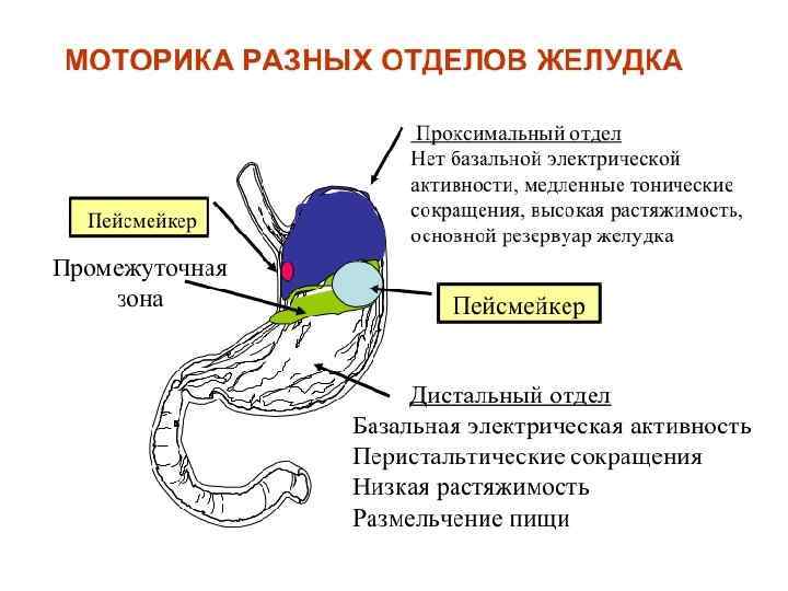 Моторика желудка Отдел желудка ПРОКСИМАЛЬНЫЙ ДИСТАЛЬНЫЙ Базальная электрическая активность нет есть Тип сокращений медленные тонические перистальтические Растяжимость высокая низкая Назначение резервуар пищи размельчение пищи