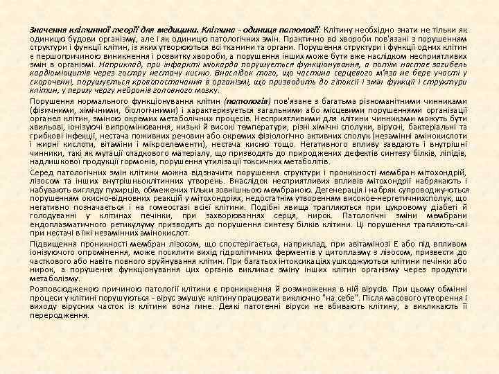 Значення клітинної теорії для медицини. Клітина - одиниця патології. Клітину необхідно знати не тільки як одиницю будови організму, але і як одиницю патологічних змін. Практично всі хвороби пов'язані з порушенням структури і функції клітин, із яких утворюються всі тканини та органи. Порушення структури і функції одних клітин є першопричиною виникнення і розвитку хвороби, а порушення інших може бути вже наслідком несприятливих змін в організмі. Наприклад, при інфаркті міокарда порушується функціонування, а потім настає загибель кардіоміоцитів через гостру нестачу кисню. Внаслідок того, що частина серцевого м'яза не бере участі у скороченні, порушується кровопостачання в організмі, що призводить до гіпоксії і змін функції і структури клітин, у першу чергу нейронів головного мозку. Порушення нормального функціонування клітин (патологія) пов'язане з багатьма різноманітними чинниками (фізичними, хімічними, біологічними) і характеризується загальними або місцевими порушеннями організації органел клітин, зміною окремих метаболічних процесів. Несприятливими для клітини чинниками можуть бути хвильові, іонізуючі випромінювання, низькі й високі температури, різні хімічні сполуки, вірусні, бактеріальні та грибкові інфекції, нестача поживних речовин або окремих фізіологічно активних сполук (незамінні амінокислоти і жирні кислоти, вітаміни і мікроелементи), нестача кисню тощо. Негативного впливу завдають і внутрішні чинники, такі як мутації спадкового матеріалу, що призводять до природжених дефектів синтезу білків, ліпідів, надлишкової продукції гормонів, порушення утилізації токсичних метаболітів. Серед патологічних змін клітини можна відзначити порушення структури і проникності мембран мітохондрій, лізосом та інших внутрішньоклітинних утворень. Внаслідок несприятливих впливів мітохондрії набрякають і набувають вигляду пухирців, обмежених тільки зовнішньою мембраною. Дегенерація і набряк супроводжу ються порушенням окисно відновних реакцій у мітохондріях, недостатнім утворенням високое нергетичних полук, що с негативно позначається і на гомеостазі всієї клітини. Подібні явища трапляються при цукровому діабеті й голодуванні у клітинах печінки, при захворюваннях серця, нирок. Патологічні зміни мембрани ендоплазматичного ретикулуму призводять до порушення синтезу білків клітини. Ці порушення трапляють ся і при нестачі в їжі незамінних амінокислот. Підвищення проникності мембран лізосом, що спостерігається, наприклад, при авітамінозі Е або під впливом іонізуючого опромінення, може посилити вихід гідролітичних ферментів у цитоплазму з лізосом, призвести до часткового або навіть повного зруйнування клітин. При багатьох інтоксикаціях ушкоджуються клітини печінки або нирок, а порушення функціонування цих органів викликає зміну інших клітин організму через продукти метаболізму. Розповсюдженою причиною патології клітини є проникнення й розмноження в ній вірусів. При цьому обмінні процеси у клітині порушуються вірус змушує клітину працювати виключно "на себе". Після масового утворення і виходу вірусних часток із клітини вона гине. Деякі патогенні віруси не вбивають клітину, а викликають її переродження.