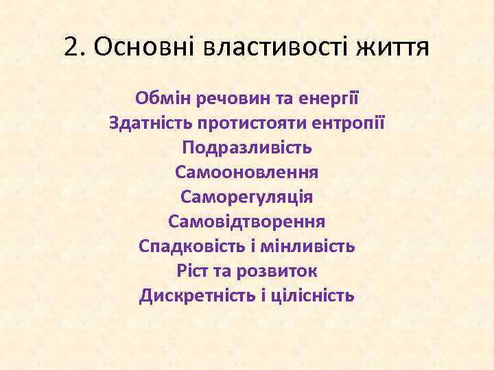 2. Основні властивості життя Обмін речовин та енергії Здатність протистояти ентропії Подразливість Самооновлення Саморегуляція Самовідтворення Спадковість і мінливість Ріст та розвиток Дискретність і цілісність