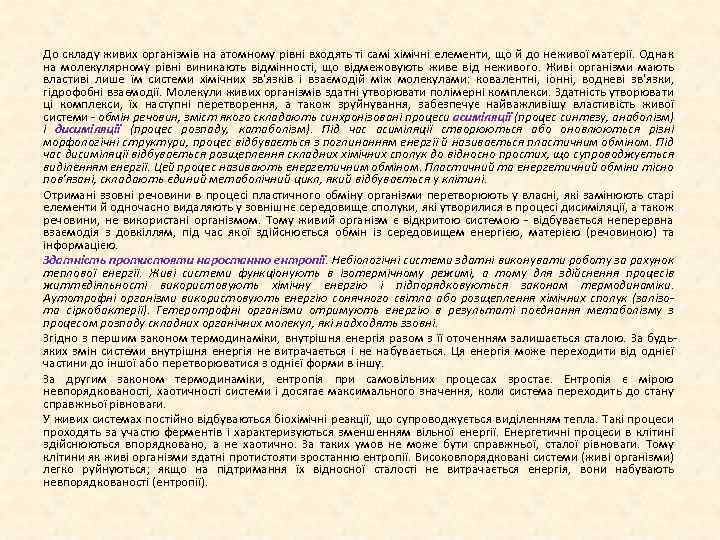 До складу живих організмів на атомному рівні входять ті самі хімічні елементи, що й до неживої матерії. Однак на молекулярному рівні виникають відмінності, що відмежовують живе від неживого. Живі організми мають властиві лише їм системи хімічних зв'язків і взаємодій між молекулами: ковалентні, іонні, водневі зв'язки, гідрофобні взаємодії. Молекули живих організмів здатні утворювати полімерні комплекси. Здатність утворювати ці комплекси, їх наступні перетворення, а також зруйнування, забезпечує найважливішу властивість живої системи обмін речовин, зміст якого складають синхронізовані процеси асиміляції (процес синтезу, анаболізм) і дисиміляції (процес розпаду, катаболізм). Під час асиміляції створюються або оновлюються різні морфологічні структури, процес відбувається з поглинанням енергії й називається пластичним обміном. Під час дисиміляції відбувається розщеплення складних хімічних сполук до відносно простих, що супроводжується виділенням енергії. Цей процес називають енергетичним обміном. Пластичний та енергетичний обміни тісно пов'язані, складають єдиний метаболічний цикл, який відбувається у клітині. Отримані ззовні речовини в процесі пластичного обміну організми перетворюють у власні, які замінюють старі елементи й одночасно видаляють у зовнішнє середовище сполуки, які утворилися в процесі дисиміляції, а також речовини, не використані організмом. Тому живий організм є відкритою системою відбувається неперервна взаємодія з довкіллям, під час якої здійснюється обмін із середовищем енергією, матерією (речовиною) та інформацією. Здатність протистояти наростанню ентропії. Небіологічні системи здатні виконувати роботу за рахунок теплової енергії. Живі системи функціонують в ізотермічному режимі, а тому для здійснення процесів життєдіяльності використовують хімічну енергію і підпорядковуються законам термодинаміки. Аутотрофні організми використовують енергію сонячного світла або розщеплення хімічних сполук (залізо та сіркобактерії). Гетеротрофні організми отримують енергію в результаті поєднання метаболізму з процесом розпаду складних органічних молекул, які надходять ззовні. Згідно з першим законом термодинаміки, внутрішня енергія разом з її оточенням залишається сталою. За будь яких змін системи внутрішня енергія не витрачається і не набувається. Ця енергія може переходити від однієї частини до іншої або перетворюватися з однієї форми в іншу. За другим законом термодинаміки, ентропія при самовільних процесах зростає. Ентропія є мірою невпорядкованості, хаотичності системи і досягає максимального значення, коли система переходить до стану справжньої рівноваги. У живих системах постійно відбуваються біохімічні реакції, що супроводжується виділенням тепла. Такі процеси проходять за участю ферментів і характеризуються зменшенням вільної енергії. Енергетичні процеси в клітині здійснюються впорядковано, а не хаотично. За таких умов не може бути справжньої, сталої рівноваги. Тому клітини як живі організми здатні протистояти зростанню ентропії. Високовпорядковані системи (живі організми) легко руйнуються; якщо на підтримання їх відносної сталості не витрачається енергія, вони набувають невпорядкованості (ентропії).