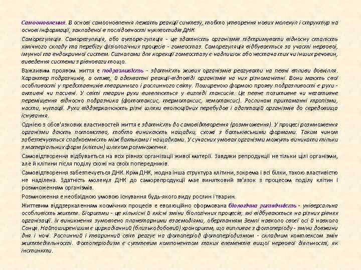Самооновлення. В основі самооновлення лежать реакції синтезу, тобто утворення нових молекул і структур на основі інформації, закладеної в послідовності нуклеотидів ДНК Саморегуляція, або ауторе гуляція це здатність організмів підтримувати відносну сталість хімічного складу та перебігу фізіологічних процесів гомеостаз. Саморегуляція відбувається за участі нервової, імунної та ендокринної систем. Сигналами для корекції гомеостазу є надлишок або нестача тих чи інших речовин, виведення системи з рівноваги тощо. Важливим проявом життя є подразливість здатність живих організмів реагувати на певні впливи довкілля. Характер подразників, а отже, й адекватні реакції відповіді організмів на них різноманітні. Вони мають свої особливості у представників тваринного і рослинного світу. Поширеною формою прояву подразливості є рухи активні чи пасивні. У світі тварин рухи виявляються у вигляді таксисів. Це певне позитивне чи негативне переміщення відносно подразника (фототаксис, термотаксис, хемотаксис). Рослинам притаманні тропізми, насти, нутації. Рухи віддзеркалюють різні шляхи еволюційних перебудов і адаптацій організмів до середовища існування. Однією з обов'язкових властивостей життя є здатність до самовідтворення (розмноження). У процесі розмноження організми дають потомство, тобто виникають нащадки, схожі з батьківськими формами. Таким чином забезпечується спадкоємність між батьками і нащадками. У сучасних умовах організми можуть виникати тільки з матеріальних форм (клітин) шляхом розмноження. Самовідтворення відбувається на всіх рівнях організації живої матерії. Завдяки репродукції не тільки цілі організми, але й клітини після поділу схожі на своїх попередників. Самовідтворення забезпечується ДНК. Крім ДНК, жодна інша структура клітини, зокрема і всі білки, такою властивістю не наділена. Здатність молекул ДНК до саморепродукції має винятковий зв'язок з процесом поділу клітин і розмноженням організмів. Розмноження є необхідною умовою існування будь якого виду рослин і тварин. Життєвим віддзеркаленням космічних процесів є еволюційно сформована біологічна ритмічність універсальна особливість життя. Біоритми це кількісні й якісні зміни біологічних процесів, які відбуваються на різних рівнях організації. їх виникнення зумовлено планетарними взаємодіями, обертанням Землі навколо своєї осі й навколо Сонця. Найпоширенішим є циркадіанний (близькодобовий) хроноритм, що випливає з фотоперіоду зміни довжини дня і ночі. Рослинний і тваринний світ реагує на фотоперіодизмом складним комплексом змін життєдіяльності. Фотоперіодизм є суттєвим компонентом таких елементів вищої нервової діяльності, як інстинкти.