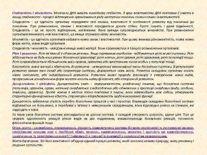 Спадковість і мінливість. Молекули ДНК мають виняткову стійкість. З цією властивістю ДНК пов'язана її участь в явищі спадковості процесі відтворення організмами в ряду наступних поколінь схожих ознак і властивостей. Спадковість це здатність організму передавати свої ознаки, властивості й особливості розвитку від покоління до покоління. При розмноженні, ознаки і властивості передаються досить стійко. Проте існують і деякі відмінності. Спадковість це не просто відтворення, копіювання. Вона завжди супроводжується мінливістю. При розмноженні організмів виникають нові властивості, це явище отримало назву мінливість. Мінливість це здатність організмів набувати нових ознак і властивостей. При цьому виникає різноманітність, поява нових форм життя, нових видів організмів. Спадковість і мінливість невід'ємні явища живої матерії. Вони проявляються в процесі розмноження організмів. Ріст і розвиток. Ріст зв'язаний з обміном речовин. Якщо переважає анаболізм відбувається ріст живої системи. Ріст здійснюється на будь яких рівнях біологічної організації: ріст клітин, ріст органів, ріст організмів, ріст популяцій тощо. Ріст супроводжується збільшенням маси органа, організму або зростанням числа особин у популяції тощо. Властивістю живої матерії є здатність до розвитку незворотної закономірної зміни біологічної системи. В результаті розвитку зазнає змін склад або структура системи, формується нова якість. Розвиток складових організму носить назву онтогенез, або індивідуальний розвиток. Розвиток живої природи (еволюція) з утворенням нових видів, прогресивним ускладненням форм життя носить назву філогенез, або історичний розвиток. Дискретність і цілісність. Дискретність (лат. переривчастість, розділення) означає, що біологічна система (популяція, організм, орган, клітина) складається з відособлених або обмежених у просторі складових (види, особини, тканини, органели). Проте кожна з частин тісно пов'язана з іншою, вони взаємодіють між собою, утворюють структурно функціональну єдність, структурну впорядкованість щодо виконуваної функції. Дискретність забезпечує сталість перебігу біологічних процесів у часі і просторі. Взаємодія складових біологічної системи відбувається не ізольовано, а перебуває у зв'язку з навколишнім середовищем, вона відповідно реагує на стимули, які надходять з зовні. За таких умов біологічна система розглядається як цілісна система. її складові утворюють цілісність, єдине ціле. Про це свідчать однотипність реакцій різних видів на дію подразника, взаємопереходи біохімічних реакцій, тотожність фізіологічних функцій тощо. Отже, життя - це особлива, впорядкована, відкрита, саморегулюча система білково-нуклеїнової та вуглеводної основи, невід'ємним явищем якої є постійний обмін речовин, самооновлення, розвиток і здатність до самовідтворення, накопичення та перетворення енергії і інформації в процесі їх взаємодії з навколишінм середовищем. Життя багатолике. Всі його властивості об'єднує єдиний процес розвитку, який охоплює неживу природу, живу речовину і людське суспільство.