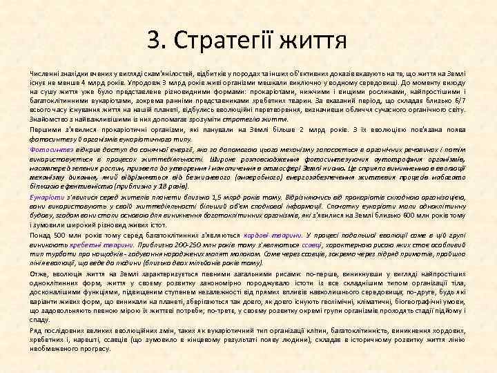 3. Стратегії життя Численні знахідки вчених у вигляді скам'янілостей, відбитків у породах та інших об'єктивних доказів вказують на те, що життя на Землі існує не менше 4 млрд років. Упродовж 3 млрд років живі організми мешкали виключно у водному середовищі. До моменту виходу на сушу життя уже було представлене різновидними формами: прокаріотами, нижчими і вищими рослинами, найпростішими і багатоклітинними еукаріотами, зокрема ранніми представниками хребетних тварин. За вказаний період, що складає близько 6/7 всього часу існування життя на нашій планеті, відбулись еволюційні перетворення, визначивши обличчя сучасного органічного світу. Знайомство з найважливішими із них допомагає зрозуміти стратегію життя. Першими з'явилися прокаріотичні організми, які панували на Землі більше 2 млрд років. З їх еволюцією пов'язана поява фотосинтезу й організмів еукаріотичного типу. Фотосинтез відкрив доступ до сонячної енергії, яка за допомогою цього механізму запасається в органічних речовинах і потім використовується в процесах життєдіяльності. Широке розповсюдження фотосинтезуючих аутотрофних організмів, насамперед зелених рослин, призвело до утворення і накопичення в атмосфері Землі кисню. Це сприяло виникненню в еволюції механізму дихання, який відрізняється від безкисневого (анаеробного) енергозабезпечення життєвих процесів набагато більшою ефективністю (приблизно у 18 разів). Еукаріоти з'явилися серед жителів планети близько 1, 5 млрд років тому. Відрізняючись від прокаріотів складною організацією, вони використовують у своїй життєдіяльності більший об'єм спадкової інформації. Спочатку еукаріоти мали одноклітинну будову, згодом вони стали основою для виникнення багатоклітинних організмів, які з'явилися на Землі близько 600 млн років тому і зумовили широкий різновид живих істот. Понад 500 млн років тому серед багатоклітинних з'являються хордові тварини. У процесі подальшої еволюції саме в цій групі виникають хребетні тварини. Приблизно 200 250 млн років тому з'являються ссавці, характерною рисою яких стає особливий тип турботи про нащадків годування народжених малят молоком. Саме через ссавців, зокрема через підряд приматів, пройшла лінія еволюції, що веде до людини (близько двох мільйонів років тому). Отже, еволюція життя на Землі характеризується певними загальними рисами: по перше, виникнувши у вигляді найпростіших одноклітинних форм, життя у своєму розвитку закономірно породжувало істоти із все складнішим типом організації тіла, досконалішими функціями, підвищеним ступенем незалежності від прямих впливів навколишнього середовища; по друге, будь які варіанти живих форм, що виникали на планеті, зберігаються так довго, як довго існують геохімічні, кліматичні, біогеографічні умови, що задовольняють певною мірою їх життєві потреби; по третє, у своєму розвитку окремі групи організмів проходять стадії підйому і спаду. Ряд послідовних великих еволюційних змін, таких як еукаріотичний тип організації клітин, багатоклітинність, виникнення хордових, хребетних і, нарешті, ссавців (що зумовило в кінцевому результаті появу людини), складає в історичному розвитку життя лінію необмеженого прогресу.
