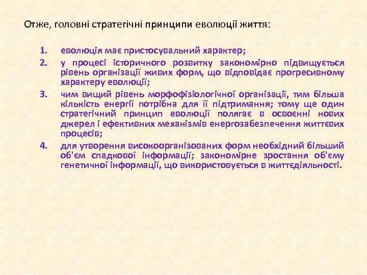 Отже, головні стратегічні принципи еволюції життя: 1. 2. 3. 4. еволюція має пристосувальний характер; у процесі історичного розвитку закономірно підвищується рівень організації живих форм, що відповідає прогресивному характеру еволюції; чим вищий рівень морфофізіологічної організації, тим більша кількість енергії потрібна для її підтримання; тому ще один стратегічний принцип еволюції полягає в освоєнні нових джерел і ефективних механізмів енергозабезпечення життєвих процесів; для утворення високоорганізованих форм необхідний більший об'єм спадкової інформації; закономірне зростання об'єму генетичної інформації, що використовується в життєдіяльності.