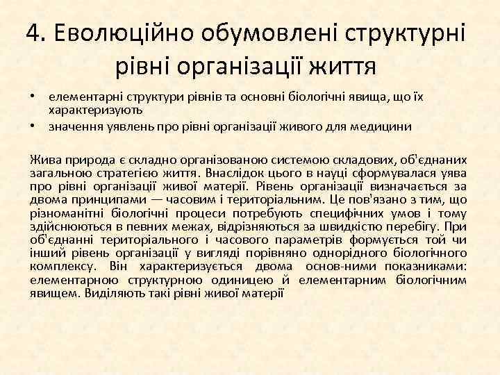 4. Еволюційно обумовлені структурні рівні організації життя • елементарні структури рівнів та основні біологічні явища, що їх характеризують • значення уявлень про рівні організації живого для медицини Жива природа є складно організованою системою складових, об'єднаних загальною стратегією життя. Внаслідок цього в науці сформувалася уява про рівні організації живої матерії. Рівень організації визначається за двома принципами — часовим і територіальним. Це пов'язано з тим, що різноманітні біологічні процеси потребують специфічних умов і тому здійснюються в певних межах, відрізняються за швидкістю перебігу. При об'єднанні територіального і часового параметрів формується той чи інший рівень організації у вигляді порівняно однорідного біологічного комплексу. Він характеризується двома основ ними показниками: елементарною структурною одиницею й елементарним біологічним явищем. Виділяють такі рівні живої матерії