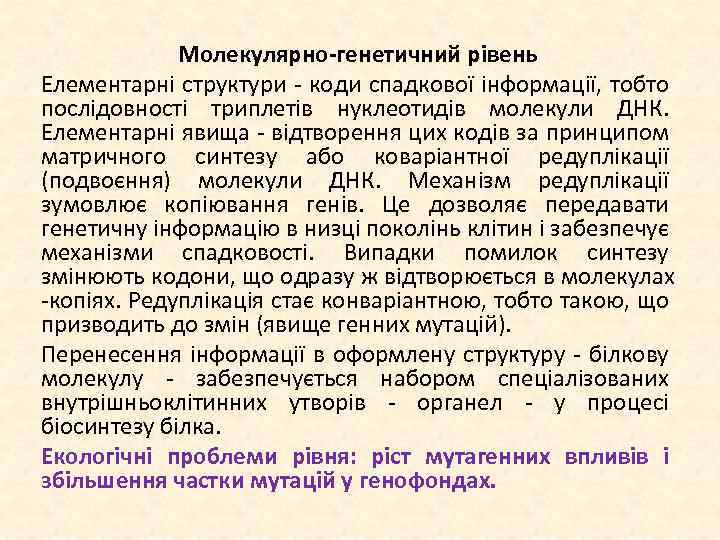 Молекулярно-генетичний рівень Елементарні структури коди спадкової інформації, тобто послідовності триплетів нуклеотидів молекули ДНК. Елементарні явища відтворення цих кодів за принципом матричного синтезу або коваріантної редуплікації (подвоєння) молекули ДНК. Механізм редуплікації зумовлює копіювання генів. Це дозволяє передавати генетичну інформацію в низці поколінь клітин і забезпечує механізми спадковості. Випадки помилок синтезу змінюють кодони, що одразу ж відтворюється в молекулах копіях. Редуплікація стає конваріантною, тобто такою, що призводить до змін (явище генних мутацій). Перенесення інформації в оформлену структуру білкову молекулу забезпечується набором спеціалізованих внутрішньоклітинних утворів органел у процесі біосинтезу білка. Екологічні проблеми рівня: ріст мутагенних впливів і збільшення частки мутацій у генофондах.