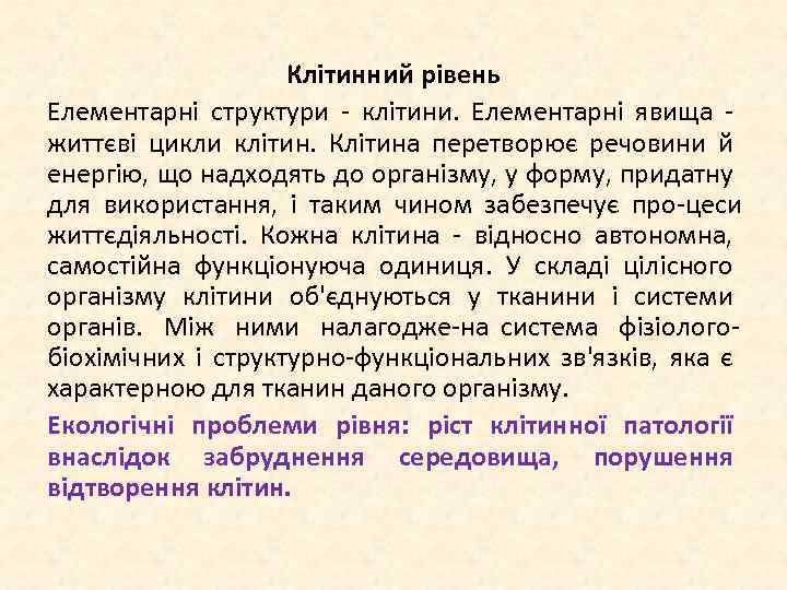 Клітинний рівень Елементарні структури клітини. Елементарні явища життєві цикли клітин. Клітина перетворює речовини й енергію, що надходять до організму, у форму, придатну для використання, і таким чином забезпечує про цеси життєдіяльності. Кожна клітина відносно автономна, самостійна функціонуюча одиниця. У складі цілісного організму клітини об'єднуються у тканини і системи органів. Між ними налагодже на система фізіолого біохімічних і структурно функціональних зв'язків, яка є характерною для тканин даного організму. Екологічні проблеми рівня: ріст клітинної патології внаслідок забруднення середовища, порушення відтворення клітин.