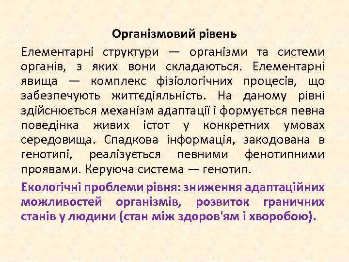 Організмовий рівень Елементарні структури — організми та системи органів, з яких вони складаються. Елементарні явища — комплекс фізіологічних процесів, що забезпечують життєдіяльність. На даному рівні здійснюється механізм адаптації і формується певна поведінка живих істот у конкретних умовах середовища. Спадкова інформація, закодована в генотипі, реалізується певними фенотипними проявами. Керуюча система — генотип. Екологічні проблеми рівня: зниження адаптаційних можливостей організмів, розвиток граничних станів у людини (стан між здоров'ям і хворобою).