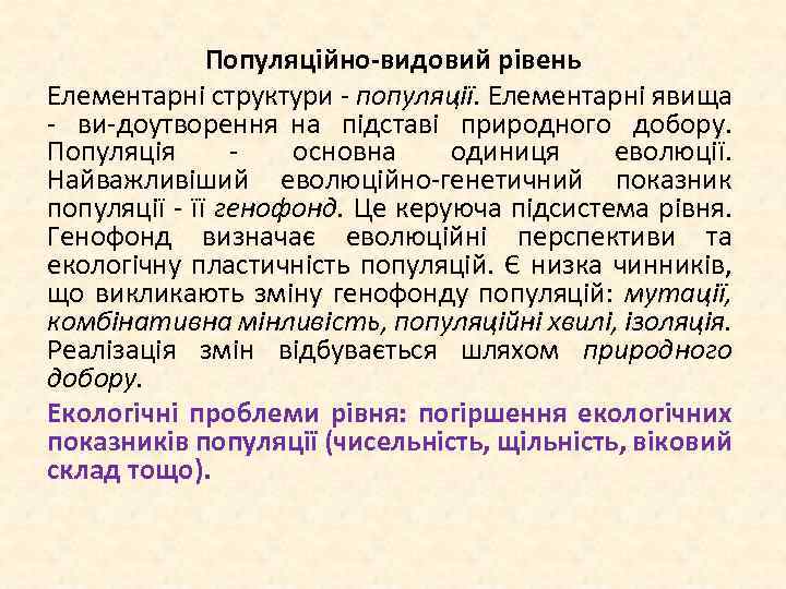 Популяційно-видовий рівень Елементарні структури популяції. Елементарні явища ви доутворення на підставі природного добору. Популяція основна одиниця еволюції. Найважливіший еволюційно генетичний показник популяції її генофонд. Це керуюча підсистема рівня. Генофонд визначає еволюційні перспективи та екологічну пластичність популяцій. Є низка чинників, що викликають зміну генофонду популяцій: мутації, комбінативна мінливість, популяційні хвилі, ізоляція. Реалізація змін відбувається шляхом природного добору. Екологічні проблеми рівня: погіршення екологічних показників популяції (чисельність, щільність, віковий склад тощо).
