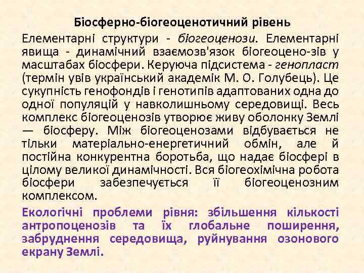 Біосферно-біогеоценотичний рівень Елементарні структури біогеоценози. Елементарні явища динамічний взаємозв'язок біогеоцено зів у масштабах біосфери. Керуюча підсистема генопласт (термін увів український академік М. О. Голубець). Це сукупність генофондів і генотипів адаптованих одна до одної популяцій у навколишньому середовищі. Весь комплекс біогеоценозів утворює живу оболонку Землі — біосферу. Між біогеоценозами відбувається не тільки матеріально енергетичний обмін, але й постійна конкурентна боротьба, що надає біосфері в цілому великої динамічності. Вся біогеохімічна робота біосфери забезпечується її біогеоценозним комплексом. Екологічні проблеми рівня: збільшення кількості антропоценозів та їх глобальне поширення, забруднення середовища, руйнування озонового екрану Землі.