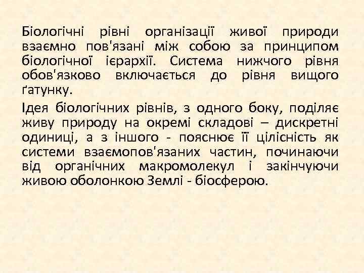 Біологічні рівні організації живої природи взаємно пов'язані між собою за принципом біологічної ієрархії. Система нижчого рівня обов'язково включається до рівня вищого ґатунку. Ідея біологічних рівнів, з одного боку, поділяє живу природу на окремі складові – дискретні одиниці, а з іншого пояснює її цілісність як системи взаємопов'язаних частин, починаючи від органічних макромолекул і закінчуючи живою оболонкою Землі біосферою.