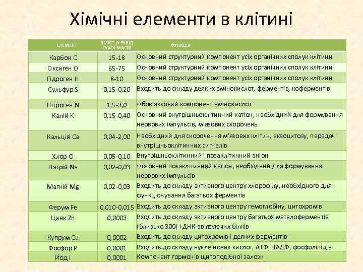 Хімічні елементи в клітині ЕЛЕМЕНТ ВМІСТ (У % ВІД СУХОЇ МАСИ) ФУНКЦІЯ Основний структурний компонент усіх органічних сполук клітини Входить до складу деяких амінокислот, ферментів, коферментів Карбон С Оксиген О Гідроген Н Сульфур S 15 18 65 75 8 10 0, 15 0, 20 Нітроген N Калій К 1, 5 3, 0 Обов'язковий компонент амінокислот 0, 15 0, 40 Основний внутрішньоклітинний катіон, необхідний для формування нервових імпульсів, м'язових скорочень Кальцій Са 0, 04 2, 00 Необхідний для скорочення м'язових клітин, екзоцитозу, передачі внутрішньоклітинних сигналів 0, 05 0, 10 Внутрішньоклітинний і позаклітинний аніон 0, 02 0, 03 Основний позаклітинний катіон, необхідний для формування нервових імпульсів 0, 02 0, 03 Входить до складу активного центру хлорофілу, необхідного для функціонування багатьох ферментів Хлор Cl Натрій Na Магній Мg Ферум Fe Цинк Zn Купрум Cu Фосфор Р Йод І 0, 010 0, 015 Входить до складу активного центру гемоглобіну, цитохромів 0, 0003 Входить до складу активного центру багатьох металоферментів (близько 300) і ДНК зв'язуючих білків 0, 0002 Входить до складу цитохромів і деяких ферментів 0, 0001 Входить до складу нуклеїнових кислот, АТФ, НАДФ, фосфоліпідів 0, 0001 Компонент гормонів щитоподібної залози