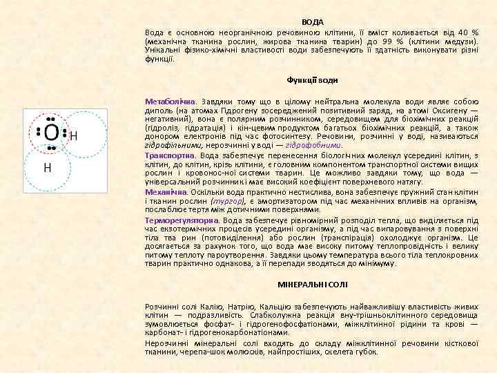 ВОДА Вода є основною неорганічною речовиною клітини, її вміст коливається від 40 % (механічна тканина рослин, жирова тканина тварин) до 99 % (клітини медузи). Унікальні фізико хімічні властивості води забезпечують її здатність виконувати різні функції. Функції води Метаболічна. Завдяки тому що в цілому нейтральна молекула води являє собою диполь (на атомах Гідрогену зосереджений позитивний заряд, на атомі Оксигену — негативний), вона є полярним розчинником, середовищем для біохімічних реакцій (гідроліз, гідратація) і кін цевим продуктом багатьох біохімічних реакцій, а також донором електронів під час фотосинтезу. Речовини, розчинні у воді, називаються гідрофільними, нерозчинні у воді — гідрофобними. Транспортна. Вода забезпечує перенесення біологічних молекул усередині клітин, з клітин, до клітин, крізь клітини, є головним компонентом транспортної системи вищих рослин і кровонос ної системи тварин. Це можливо завдяки тому, що вода — універсальний розчинник і має високий коефіцієнт поверхневого натягу. Механічна. Оскільки вода практично нестислива, вона забезпечує пружний стан клітин і тканин рослин (тургор), є амортизатором під час механічних впливів на організм, послаблює тертя між дотичними поверхнями. Терморегуляторна. Вода забезпечує рівномірний розподіл тепла, що виділяється під час екзотермічних процесів усередині організму, а під час випаровування з поверхні тіла тва рин (потовиділення) або рослин (транспірація) охолоджує організм. Це досягається за рахунок того, що вода має високу питому теплопровідність і велику питому теплоту пароутворення. Завдяки цьому температура всього тіла теплокровних тварин практично однакова, а її перепади зводяться до мінімуму. МІНЕРАЛЬНІ СОЛІ Розчинні солі Калію, Натрію, Кальцію забезпечують найважливішу властивість живих клітин — подразливість. Слабколужна реакція вну трішньоклітинного середовища зумовлюється фосфат і гідрогенофосфатіонами, міжклітинної рідини та крові — карбонат і гідрогенокарбонатіонами. Нерозчинні мінеральні солі входять до складу міжклітинної речовини кісткової тканини, черепа шок молюсків, найпростіших, скелета губок.