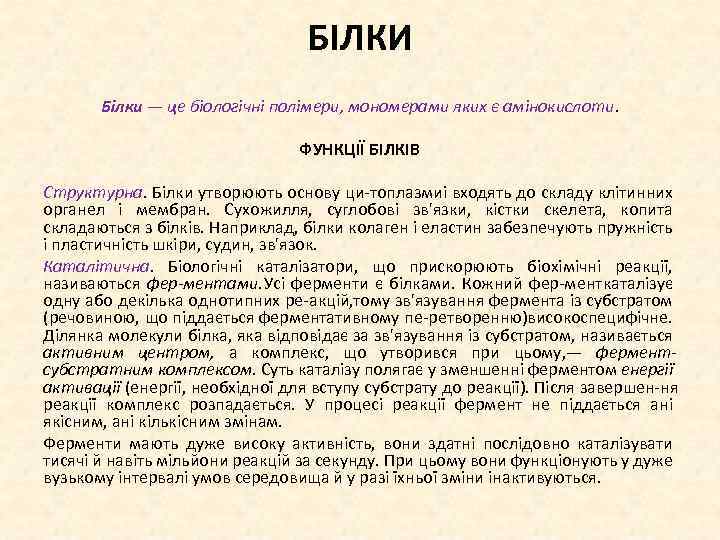 БІЛКИ Білки — це біологічні полімери, мономерами яких є амінокислоти. ФУНКЦІЇ БІЛКІВ Структурна. Білки утворюють основу ци топлазми входять до складу клітинних і органел і мембран. Сухожилля, суглобові зв'язки, кістки скелета, копита складаються з білків. Наприклад, білки колаген і еластин забезпечують пружність і пластичність шкіри, судин, зв'язок. Каталітична. Біологічні каталізатори, що прискорюють біохімічні реакції, називаються фер ментами. Усі ферменти є білками. Кожний фер мент каталізує одну або декілька однотипних ре акцій, ому зв'язування фермента із субстратом т (речовиною, що піддається ферментативному пе ретворенню) исокоспецифічне. в Ділянка молекули білка, яка відповідає за зв'язування із субстратом, називається активним центром, а комплекс, що утворився при цьому, — фермент субстратним комплексом. Суть каталізу полягає у зменшенні ферментом енергії активації (енергії, необхідної для вступу субстрату до реакції). Після завершен ня реакції комплекс розпадається. У процесі реакції фермент не піддається ані якісним, ані кількісним змінам. Ферменти мають дуже високу активність, вони здатні послідовно каталізувати тисячі й навіть мільйони реакцій за секунду. При цьому вони функціонують у дуже вузькому інтервалі умов середовища й у разі їхньої зміни інактивуються.