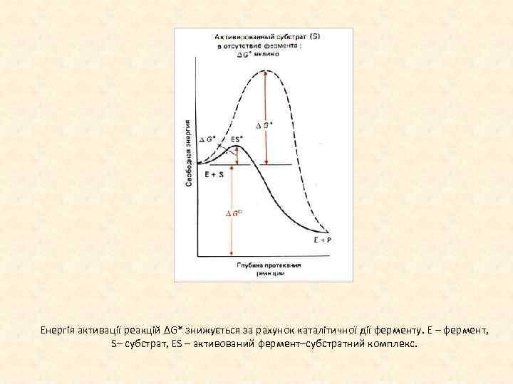 Енергія активації реакцій ΔG* знижується за рахунок каталітичної дії ферменту. Е – фермент, S– субстрат, ES – активований фермент–субстратний комплекс.