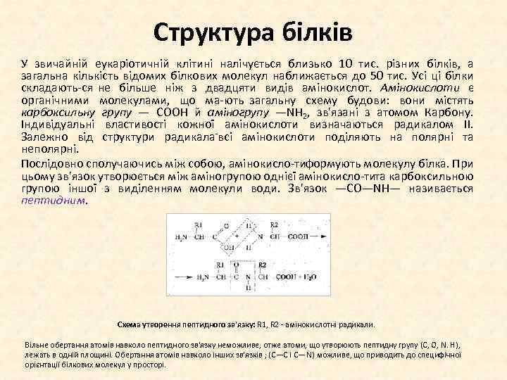 Структура білків У звичайній еукаріотичній клітині налічується близько 10 тис. різних білків, а загальна кількість відомих білкових молекул наближається до 50 тис. Усі ці білки складають ся не більше ніж з двадцяти видів амінокислот. Амінокислоти є органічними молекулами, що ма ють загальну схему будови: вони містять карбоксильну групу — СООН й аміногрупу —NН 2, зв'язані з атомом Карбону. Індивідуальні властивості кожної амінокислоти визначаються радикалом II. Залежно від структури радикала всі амінокислоти поділяють на полярні та неполярні. Послідовно сполучаючись між собою, амінокисло ти ормують молекулу білка. При ф цьому зв'язок утворюється між аміногрупою однієї амінокисло ти а карбоксильною т групою іншої з виділенням молекули води. Зв'язок —СО—NH— називається пептидним. Схема утворення пептидного зв'язку: R 1, R 2 амінокислотні радикали. Вільне обертання атомів навколо пептидного зв'язку неможливе, отже атоми, що утворюють пептидну групу (С, О, N. Н), лежать в одній площині. Обертання атомів навколо інших зв'язків ; (С—С і С—N) можливе, що приводить до специфічної орієнтації білкових молекул у просторі.