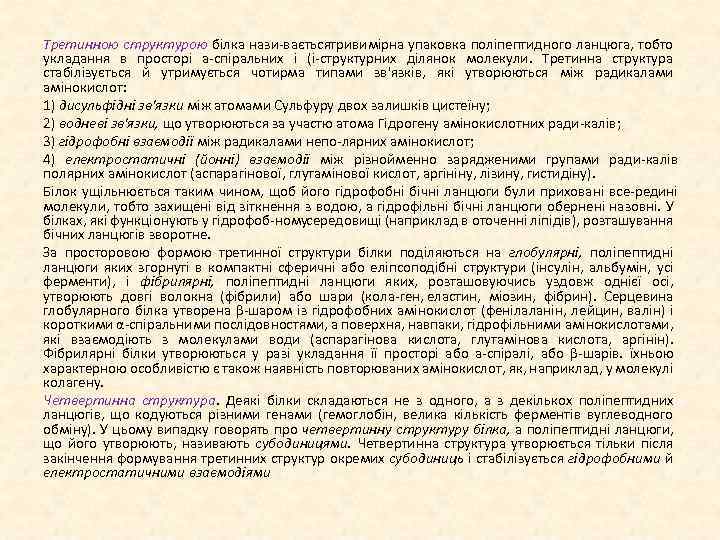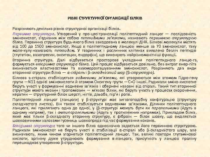 РІВНІ СТРУКТУРНОЇ ОРГАНІЗАЦІЇ БІЛКІВ Розрізняють декілька рівнів структурної організації білків. Первинна структура. Утворений у про цесі трансляції поліпептидний ланцюг — послідовність амінокислот, з'єднаних між собою пептидними зв'язками, називають первинною структурою білка. Первинна структура будь якого білка закодована в молекулі ДНК. Білкові молекули містять від 100 до 1500 амінокислот. Якщо в поліпептидному ланцюзі менше за 70 амінокислот, таку моле кулу називають пептидом. У тваринних і рослинних клітинах виявлено безліч пептидів (глутатіон, вазопресин, окситоцин, ендорфін), що виконують найрізноманітніші функції. Вторинна структура. Далі відбувається просторове укладання поліпептидного ланцю га, формується вторинна структура білка. Цей процес відбувається довільно, без витрат енер гії а т визначається властивостями та взаєморозташуванням амінокислот. Розрізняють два види вторинної структури білка — α спіраль і β складчастий шар (β структура). Білкова а спіраль стабілізується водневими зв'язками, які утворюються між атомом Гідро гену групи —N 11 однієї амінокислоти й атомом Оксигену групи —С=O іншої. Радикали аміно кислот е н беруть участі у формуванні водневих зв'язків і обернені назовні від спіралі. Такий тип вторинної структури мають міозин і тропоміозин — м'язові білки, які беруть участь у процесах скорочення, кератин — структурний білок шерсті, нігтів, дзьоба, пір'я і рогів. Поліпептидний ланцюг (ланцюги) у β структурі має зигзагоподібну конфігурацію (структуру складчастого листка). Він також стабілізується водневими зв'язками. Ділянки поліпептидного ланцюга, які прилягають одна до одної, у (β структурі можуть бути як паралельними (йдуть в одному напрямі), так і антипаралельними (йдуть у протилежних напрямах). Прикладом білка, який має тільки β складчасту вторинну структуру, є фіброїн — білок шовку, що виділяється шовковичними залозами гусениць шовкопряда під час формування коконів. Вторинна структура того чи іншого білка однозначно задається його первинною структурою. Радикали амінокислот не беруть участі в стабілізації α спіралі або β складчастого шару, але визначають, яким чином згорнеться поліпептидний ланцюг. Так, великі повтори глутамінової кислоти, аргініну дуже утруднюють формування α ланцюга, присутність у ланцюзі проліну перешкоджає утворенню β структури.
