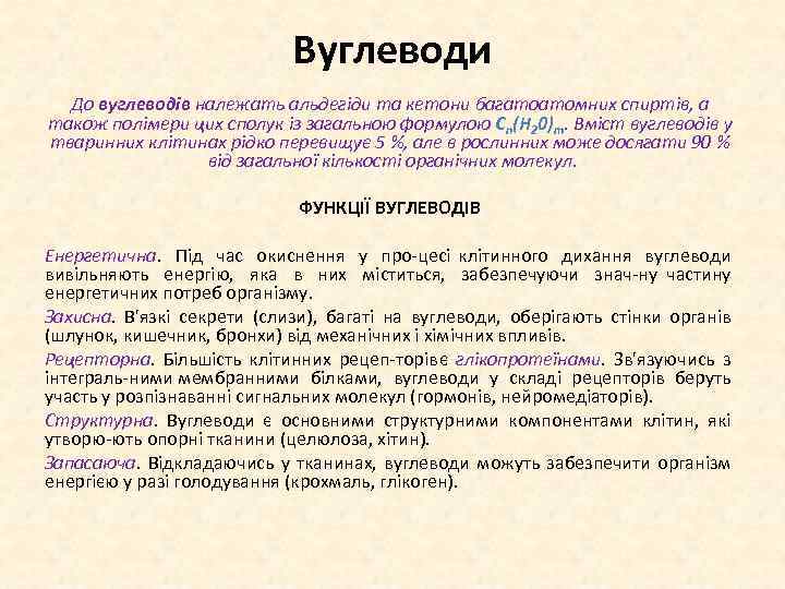 Вуглеводи До вуглеводів належать альдегіди та кетони багатоатомних спиртів, а також полімери цих сполук із загальною формулою Сn(Н 20)m. Вміст вуглеводів у тваринних клітинах рідко перевищує 5 %, але в рослинних може досягати 90 % від загальної кількості органічних молекул. ФУНКЦІЇ ВУГЛЕВОДІВ Енергетична. Під час окиснення у про цесі клітинного дихання вуглеводи вивільняють енергію, яка в них міститься, забезпечуючи знач ну частину енергетичних потреб організму. Захисна. В'язкі секрети (слизи), багаті на вуглеводи, оберігають стінки органів (шлунок, кишечник, бронхи) від механічних і хімічних впливів. Рецепторна. Більшість клітинних рецеп торів є глікопротеїнами. Зв'язуючись з інтеграль ними мембранними білками, вуглеводи у складі рецепторів беруть участь у розпізнаванні сигнальних молекул (гормонів, нейромедіаторів). Структурна. Вуглеводи є основними структурними компонентами клітин, які утворю ють опорні тканини (целюлоза, хітин). Запасаюча. Відкладаючись у тканинах, вуглеводи можуть забезпечити організм енергією у разі голодування (крохмаль, глікоген).