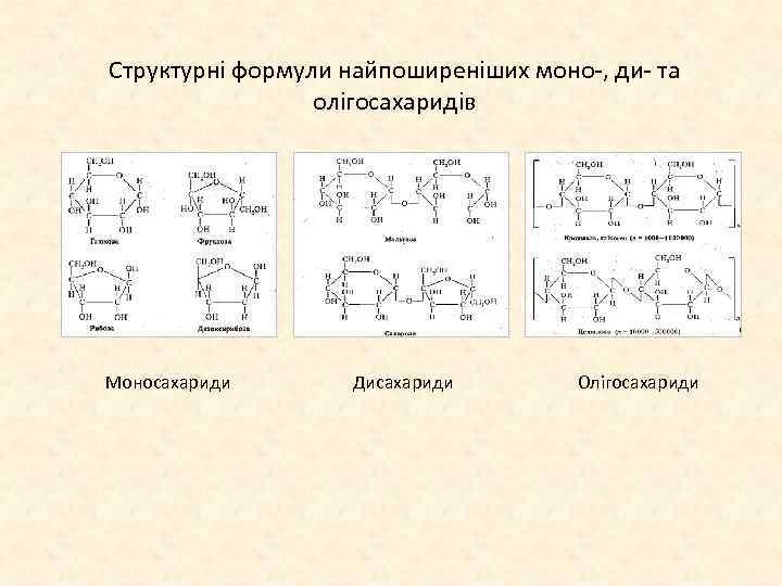 Структурні формули найпоширеніших моно , ди та олігосахаридів Моносахариди Дисахариди Олігосахариди