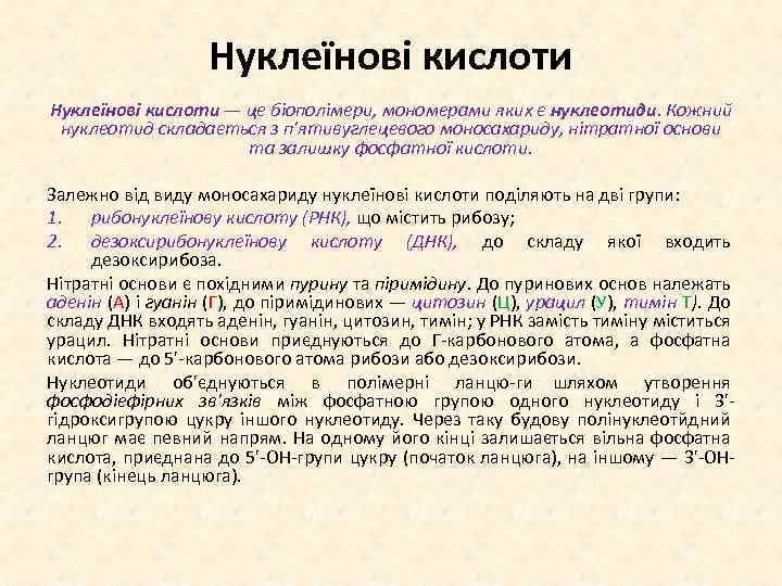 Нуклеїнові кислоти — це біополімери, мономерами яких є нуклеотиди. Кожний нуклеотид складається з п'ятивуглецевого моносахариду, нітратної основи та залишку фосфатної кислоти. Залежно від виду моносахариду нуклеїнові кислоти поділяють на дві групи: 1. рибонуклеїнову кислоту (РНК), що містить рибозу; 2. дезоксирибонуклеїнову кислоту (ДНК), до складу якої входить дезоксирибоза. Нітратні основи є похідними пурину та піримідину. До пуринових основ належать аденін (А) і гуанін (Г), до піримідинових — цитозин (Ц), урацил (У), тимін Т). До складу ДНК входять аденін, гуанін, цитозин, тимін; у РНК замість тиміну міститься урацил. Нітратні основи приєднуються до Г карбонового атома, а фосфатна кислота — до 5' карбонового атома рибози або дезоксирибози. Нуклеотиди об'єднуються в полімерні ланцю ги шляхом утворення фосфодіефірних зв'язків між фосфатною групою одного нуклеотиду і 3' гідроксигрупою цукру іншого нуклеотиду. Через таку будову полінуклеотйдний ланцюг має певний напрям. На одному його кінці залишається вільна фосфатна кислота, приєднана до 5' ОН групи цукру (початок ланцюга), на іншому — 3' ОН група (кінець ланцюга).