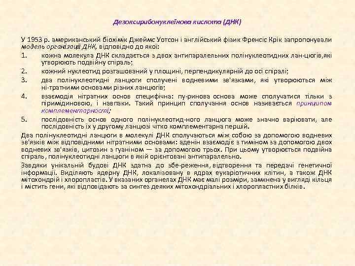Дезоксирибонуклеїнова кислота (ДНК) У 1953 р. американський біохімік Джеймс Уотсон і англійський фізик Френсіс Крік запропонували модель організації ДНК, відповідно до якої: 1. кожна молекула ДНК складається з двох антипаралельних полінуклеотидних лан цюгів, кі я утворюють подвійну спіраль; 2. кожний нуклеотид розташований у площині, перпендикулярній до осі спіралі; 3. два полінуклеотидні ланцюги сполучені водневими зв'язками, які утворюються між ні тратними основами різних ланцюгів; 4. взаємодія нітратних основ специфічна: пу ринова основа може сполучатися тільки з піримідиновою, і навпаки. Такий принцип сполучання основ називається принципом комплементарності; 5. послідовність основ одного полінуклеотид ного ланцюга може значно варіювати, але послідовність їх у другому ланцюзі чітко комплементарна першій. Два полінуклеотидні ланцюги в молекулі ДНК сполучаються між собою за допомогою водневих зв'язків між відповідними нітратними основами: аденін взаємодіє з тиміном за допомогою двох водневих зв'язків, цитозин з гуаніном — за допомогою трьох. При цьому утворюється подвійна спіраль, полінуклеотидні ланцюги в якій орієнтовані антипаралельно. Завдяки унікальній будові ДНК здатна до збе реження, відтворення та передачі генетичної інформації. Виділяють ядерну ДНК, локалізовану в ядрах еукаріотичних клітин, а також ДНК мітохондрій і хлоропластів. У вказаних органелах ДНК має малі розміри, замкнена у вигляді кільця і містить гени, які відповідають за синтез деяких мітохондріальних і хлоропластних білків.