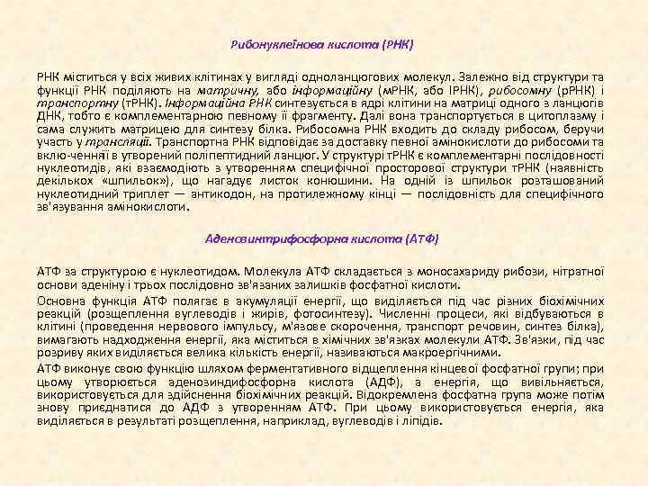 Рибонуклеїнова кислота (РНК) РНК міститься у всіх живих клітинах у вигляді одноланцюгових молекул. Залежно від структури та функції РНК поділяють на матричну, або інформаційну (м. РНК, або ІРНК), рибосомну (р. РНК) і транспортну (т. РНК). Інформаційна РНК синтезується в ядрі клітини на матриці одного з ланцюгів ДНК, тобто є комплементарною певному її фрагменту. Далі вона транспортується в цитоплазму і сама служить матрицею для синтезу білка. Рибосомна РНК входить до складу рибосом, беручи участь у трансляції. Транспортна РНК відповідає за доставку певної амінокислоти до рибосоми та вклю чення ї в утворений поліпептидний ланцюг. У структурі т. РНК є комплементарні послідовності ї нуклеотидів, які взаємодіють з утворенням специфічної просторової структури т. РНК (наявність декількох «шпильок» ), що нагадує листок конюшини. На одній із шпильок розташований нуклеотидний триплет — антикодон, на протилежному кінці — послідовність для специфічного зв'язування амінокислоти. Аденозинтрифосфорна кислота (АТФ) АТФ за структурою є нуклеотидом. Молекула АТФ складається з моносахариду рибози, нітратної основи аденіну і трьох послідовно зв'язаних залишків фосфатної кислоти. Основна функція АТФ полягає в акумуляції енергії, що виділяється під час різних біохімічних реакцій (розщеплення вуглеводів і жирів, фотосинтезу). Численні процеси, які відбуваються в клітині (проведення нервового імпульсу, м'язове скорочення, транспорт речовин, синтез білка), вимагають надходження енергії, яка міститься в хімічних зв'язках молекули АТФ. Зв'язки, під час розриву яких виділяється велика кількість енергії, називаються макроергічними. АТФ виконує свою функцію шляхом ферментативного відщеплення кінцевої фосфатної групи; при цьому утворюється аденозиндифосфорна кислота (АДФ), а енергія, що вивільняється, використовується для здійснення біохімічних реакцій. Відокремлена фосфатна група може потім знову приєднатися до АДФ з утворенням АТФ. При цьому використовується енергія, яка виділяється в результаті розщеплення, наприклад, вуглеводів і ліпідів.