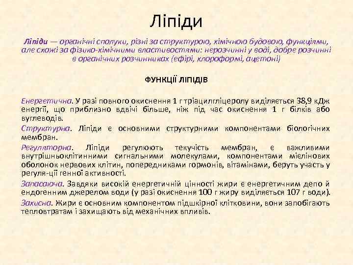 Ліпіди — органічні сполуки, різні за структурою, хімічною будовою, функціями, але схожі за фізико хімічними властивостями: нерозчинні у воді, добре розчинні в органічних розчинниках (ефірі, хлороформі, ацетоні) ФУНКЦІЇ ЛІПІДІВ Енергетична. У разі повного окиснення 1 г тріацилгліцеролу виділяється 38, 9 к. Дж енергії, що приблизно вдвічі більше, ніж під час окиснення 1 г білків або вуглеводів. Структурна. Ліпіди є основними структурними компонентами біологічних мембран. Регуляторна. Ліпіди регулюють текучість мембран, є важливими внутрішньоклітинними сигнальними молекулами, компонентами мієлінових оболонок нервових клітин, попередниками гормонів, вітамінами, беруть участь у регуля ції генної активності. Запасаюча. Завдяки високій енергетичній цінності жири є енергетичним депо й ендогенним джерелом води (у разі окиснення 100 г жиру виділяється 107 г води). Захисна. Жири є основним компонентом підшкірної клітковини, вони запобігають тепловтратам і захищають від механічних впливів.