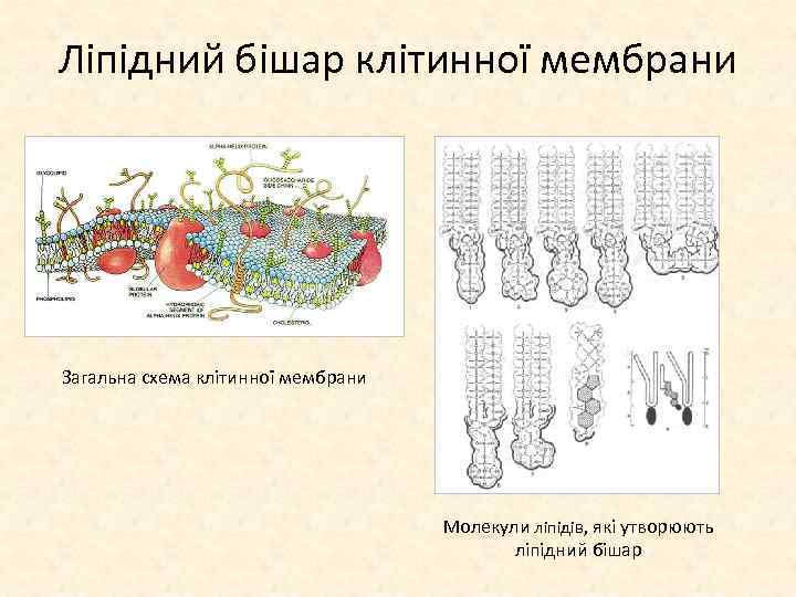 Ліпідний бішар клітинної мембрани Загальна схема клітинної мембрани Молекули ліпідів, які утворюють ліпідний бішар