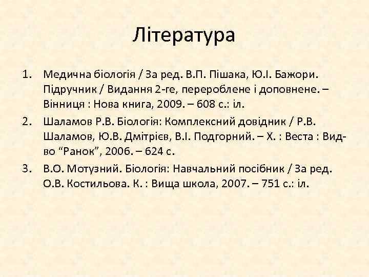 Література 1. Медична біологія / За ред. В. П. Пішака, Ю. І. Бажори. Підручник / Видання 2 ге, перероблене і доповнене. – Вінниця : Нова книга, 2009. – 608 с. : іл. 2. Шаламов Р. В. Біологія: Комплексний довідник / Р. В. Шаламов, Ю. В. Дмітрієв, В. І. Подгорний. – Х. : Веста : Вид во “Ранок”, 2006. – 624 с. 3. В. О. Мотузний. Біологія: Навчальний посібник / За ред. О. В. Костильова. К. : Вища школа, 2007. – 751 с. : іл.