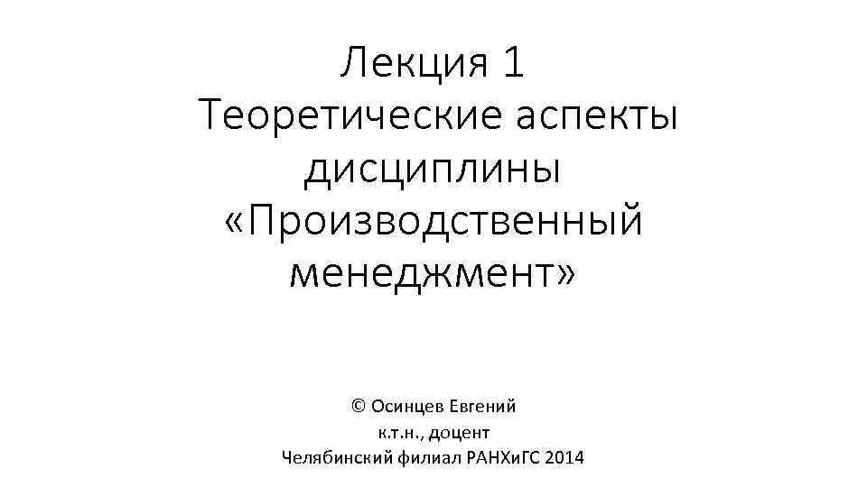 Лекция 1 Теоретические аспекты дисциплины «Производственный менеджмент» © Осинцев Евгений к. т. н. , доцент Челябинский филиал РАНХи. ГС 2014