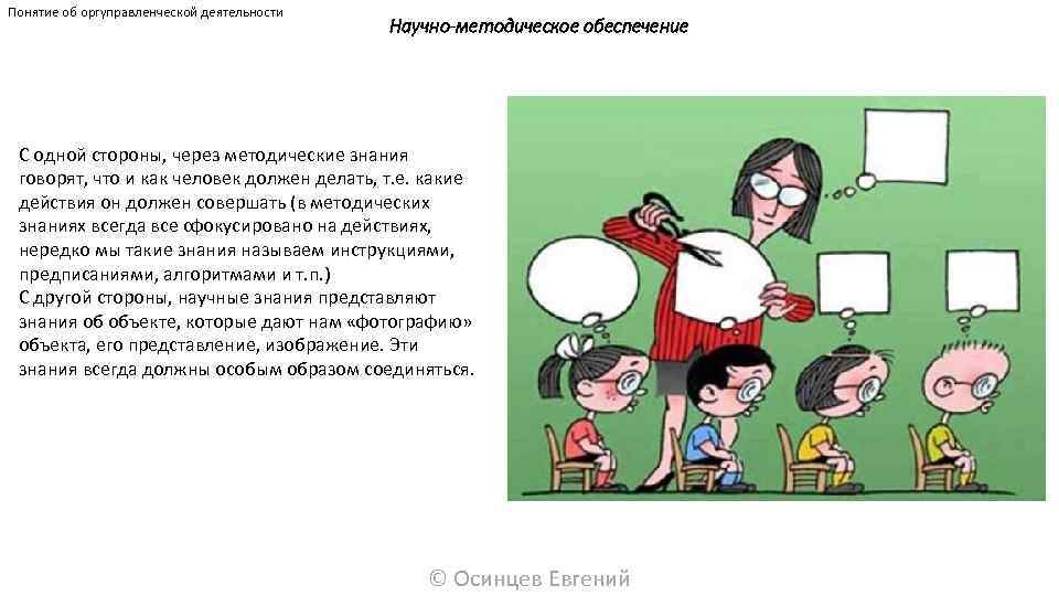 Понятие об оргуправленческой деятельности Научно-методическое обеспечение С одной стороны, через методические знания говорят, что и как человек должен делать, т. е. какие действия он должен совершать (в методических знаниях всегда все сфокусировано на действиях, нередко мы такие знания называем инструкциями, предписаниями, алгоритмами и т. п. ) С другой стороны, научные знания представляют знания об объекте, которые дают нам «фотографию» объекта, его представление, изображение. Эти знания всегда должны особым образом соединяться. © Осинцев Евгений