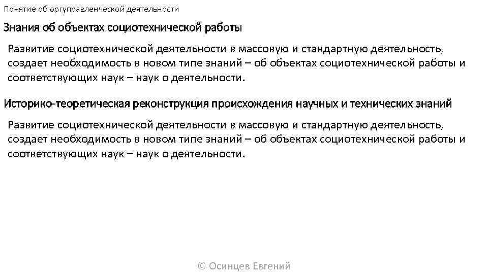 Понятие об оргуправленческой деятельности Знания об объектах социотехнической работы Развитие социотехнической деятельности в массовую и стандартную деятельность, создает необходимость в новом типе знаний – об объектах социотехнической работы и соответствующих наук – наук о деятельности. Историко-теоретическая реконструкция происхождения научных и технических знаний Развитие социотехнической деятельности в массовую и стандартную деятельность, создает необходимость в новом типе знаний – об объектах социотехнической работы и соответствующих наук – наук о деятельности. © Осинцев Евгений
