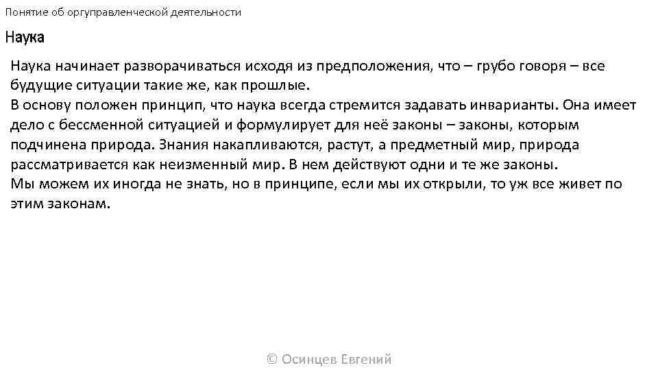 Понятие об оргуправленческой деятельности Наука начинает разворачиваться исходя из предположения, что – грубо говоря – все будущие ситуации такие же, как прошлые. В основу положен принцип, что наука всегда стремится задавать инварианты. Она имеет дело с бессменной ситуацией и формулирует для неё законы – законы, которым подчинена природа. Знания накапливаются, растут, а предметный мир, природа рассматривается как неизменный мир. В нем действуют одни и те же законы. Мы можем их иногда не знать, но в принципе, если мы их открыли, то уж все живет по этим законам. © Осинцев Евгений