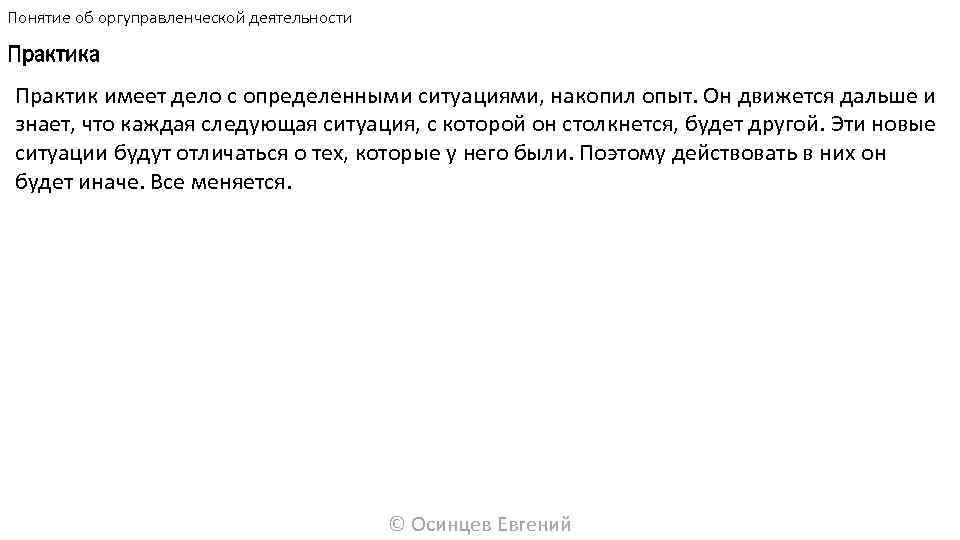 Понятие об оргуправленческой деятельности Практика Практик имеет дело с определенными ситуациями, накопил опыт. Он движется дальше и знает, что каждая следующая ситуация, с которой он столкнется, будет другой. Эти новые ситуации будут отличаться о тех, которые у него были. Поэтому действовать в них он будет иначе. Все меняется. © Осинцев Евгений
