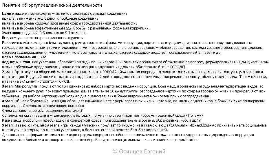 Понятие об оргуправленческой деятельности Цели и задачи: познакомить участников семинара с видами коррупции; привлечь внимание молодежи к проблеме коррупции; выявить наиболее коррумпированные сферы государственной деятельности; выявить наиболее эффективные методы борьбы с различными формами коррупции. Участники: ведущий, 3 -5 команд по 5 -7 человек. Возраст: учащиеся старших классов и студенты. Реквизит: самоклеющаяся бумага, листы, ручки, карточки с формами коррупции, карточки с ситуациями, где встречается коррупция, плакаты с государственными институтами и учреждениями: правоохранительные органы, высшие учебные заведения, система среднего образования, церковь, система здравоохранения, учреждения культуры, спорта и отдыха, система судопроизводства, государственный аппарат и др. Время проведения: 1 час. Ход игры: 1 этап. Все участники образуют команды по 5 -7 человек. В командах организуется обсуждение по вопросу формирования ГОРОДА (участникам игры необходимо предположить, какие организации и учреждения должны обязательно быть в ГОРОДЕ). 2 этап. Организуется общее обсуждение «строительства» ГОРОДА. Команды по очереди предлагают различные социальные институты, учреждения и организации. Ведущий после того, как учреждения какой-либо городской сферы озвучены, прикрепляет на доску таблицу с названием. Таким образом, в течение 5 -7 минут «строится» ГОРОД. 3 этап. Микрогруппы получают по три одинаковых набора карточек с видами коррупции. Если у аудитории есть затруднения интерпретации видов, то ведущий комментирует, приводит примеры. Далее в течение 10 минут группы распределяют карточки по сферам городской жизни и прикрепляют их к таблицам. Три набора карточек необходимо для предоставления более широких возможностей при их распределении. 4 этап. Общее обсуждение. Ведущий обращает внимание на те сферы городской жизни, которые, по мнению участников, в большей силе подвержены коррупции. Обсуждаются следующие вопросы: С чем связано такое распределение карточек? Остались ли организации и учреждения, в которых, по мнению участников, нет коррумпированной среду? Почему? Какие виды коррупции преобладают в конкретной сфере (правоохранительные органы, образование, ЖКХ и др. )? 5 этап. На заключительном этапе игры каждый участник получает три кружочка из самоклеющейся бумаги. Их необходимо приклеить на те социальные институты, в которых, по мнению участников, в большей степени ведется борьба с коррупцией. Данная игровая форма позволяет наглядно продемонстрировать общественное мнение о том, в каких государственных учреждениях коррупция получила наибольшее распространение, в каких борьба с данным социальным явление наиболее результативна. © Осинцев Евгений