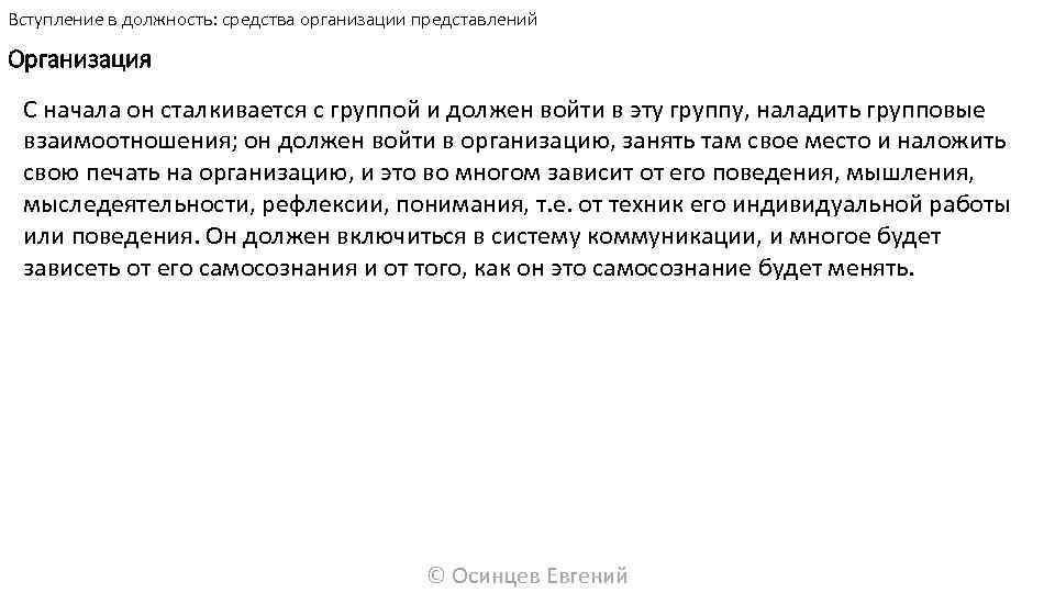 Вступление в должность: средства организации представлений Организация С начала он сталкивается с группой и должен войти в эту группу, наладить групповые взаимоотношения; он должен войти в организацию, занять там свое место и наложить свою печать на организацию, и это во многом зависит от его поведения, мышления, мыследеятельности, рефлексии, понимания, т. е. от техник его индивидуальной работы или поведения. Он должен включиться в систему коммуникации, и многое будет зависеть от его самосознания и от того, как он это самосознание будет менять. © Осинцев Евгений