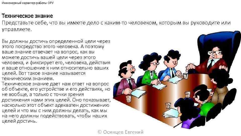 Инженерный характер работы ОРУ Техническое знание Представьте себе, что вы имеете дело с каким-то человеком, которым вы руководите или управляете. Вы должны достичь определенной цели через этого посредство этого человека. А поэтому ваше знание отвечает на вопрос, как вы можете достичь вашей цели через этого человека, и фиксирует его, человека, действия и ваше отношение к ним относительно ваших целей. Вот такое знание называется техническим знанием. Техническое знание дает нам ответ на вопрос об объекте, его устройстве и его действиях, но не вообще, а только с точки зрения достижения нами этих целей. Оно показывает, насколько этот объект адекватен достижению целей и что мы с ним должны делать, как мы на него должны подействовать, чтобы наших целей достичь. © Осинцев Евгений